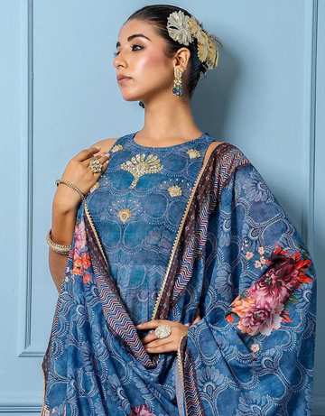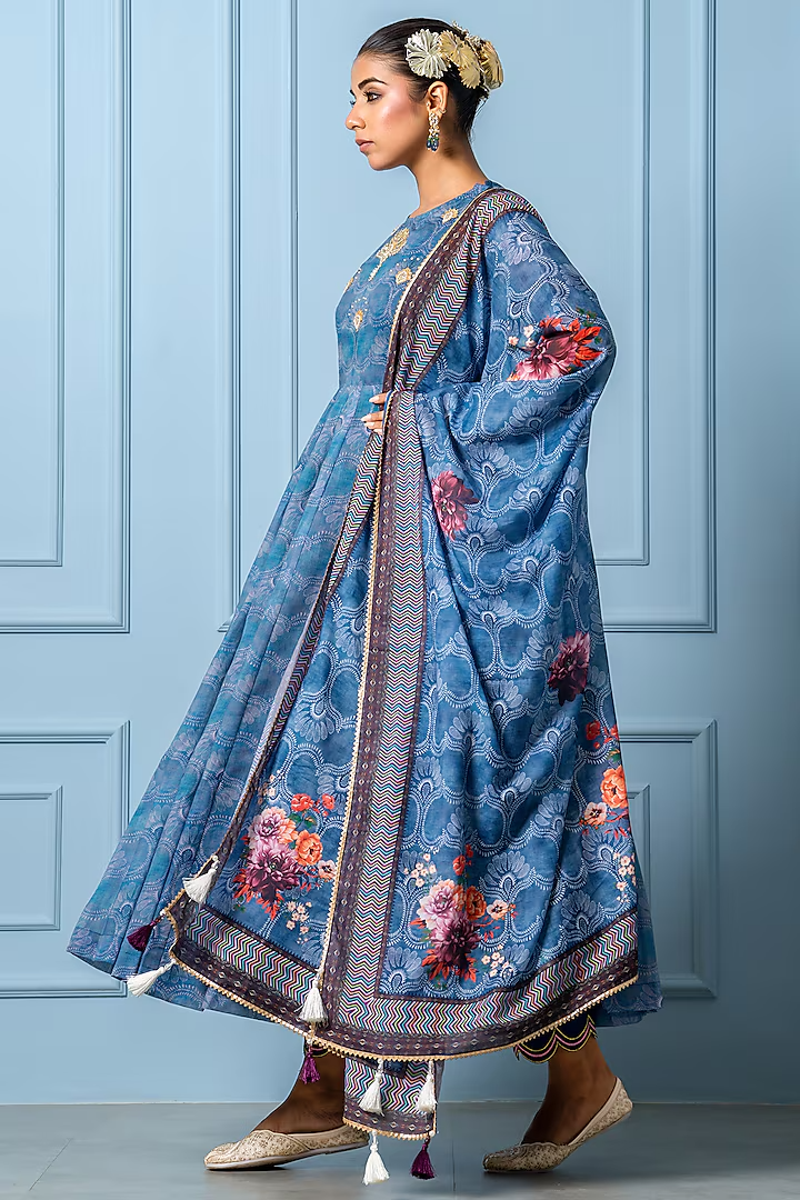 Featuring a navy blue anarkali in chanderi base with digital floral print and dabka embroidery. It is paired with pants and muslin printed dupatta.