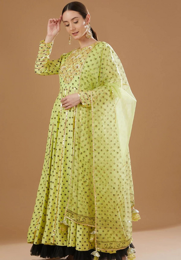 Neon Green & Grey Chanderi Floral Printed Anarkali Set - 2