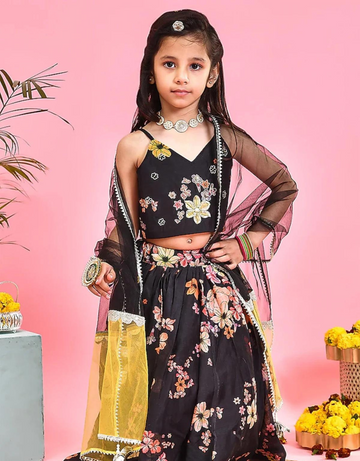 Mustard Yellow Silk Lehenga Set For Girls