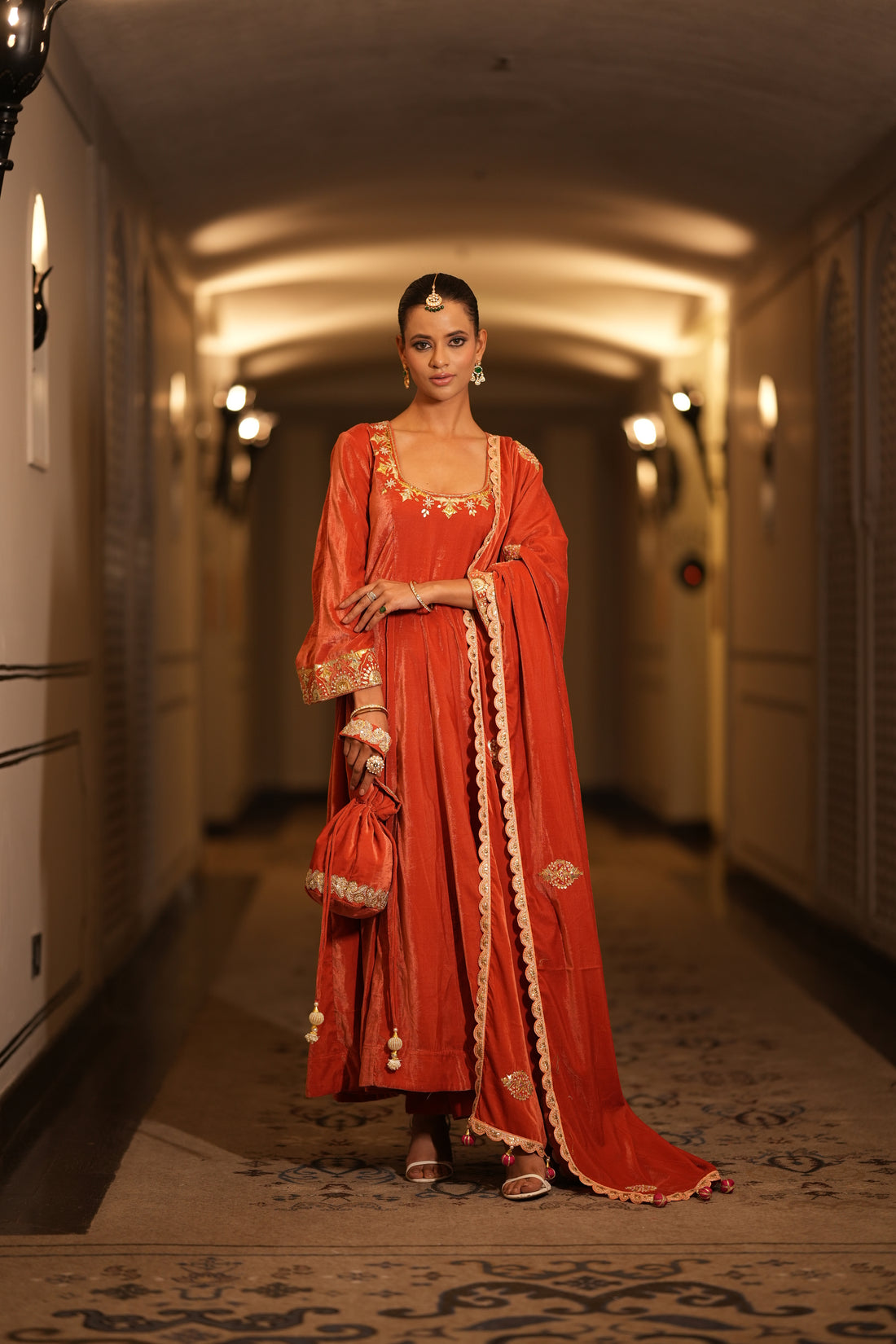 Hand Embroidered Peach Churidaar sleeves Velvet Anarkali Set