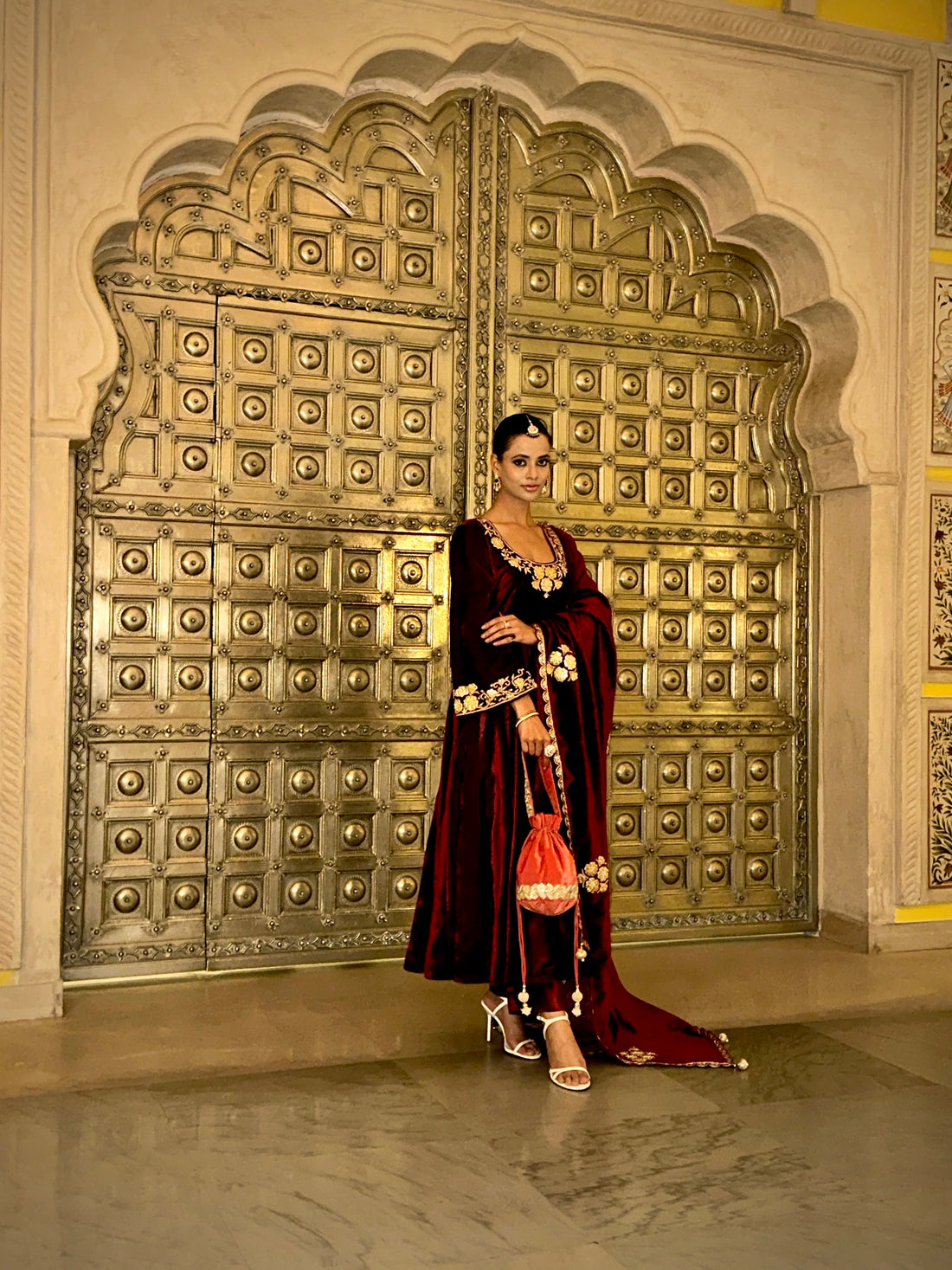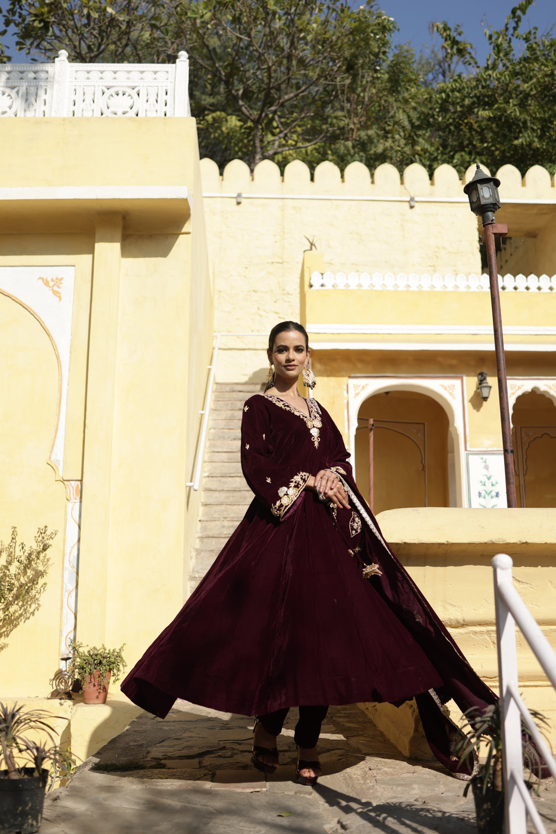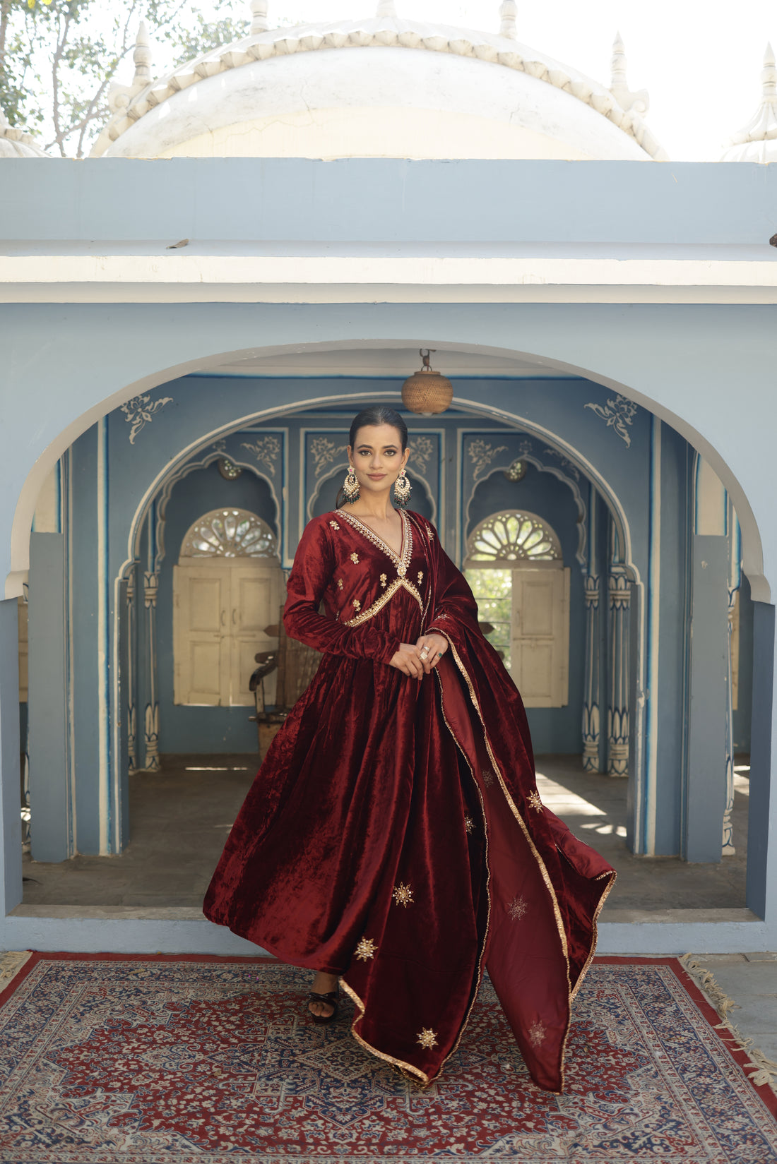 Hand Embroidered Maroon Flared sleeves Velvet Anarkali Set