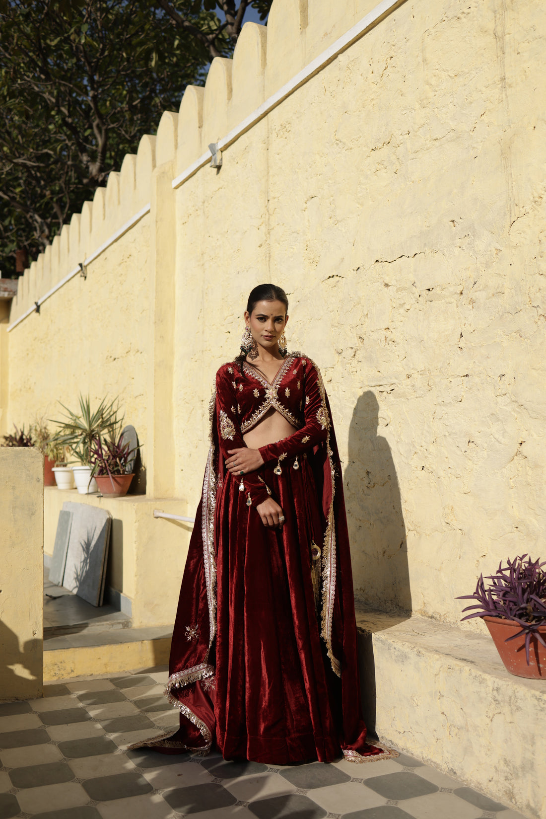 Hand Embroidered Maroon full sleeves Velvet Lehenga Set