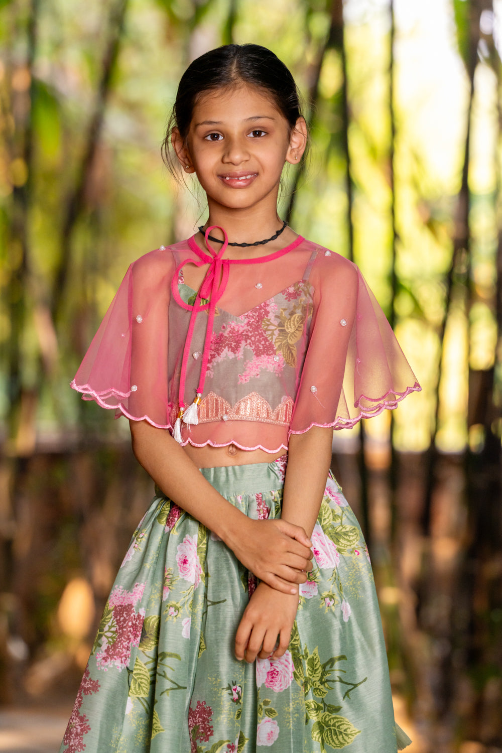 Neon Pink Silk Lehenga Set For Girls