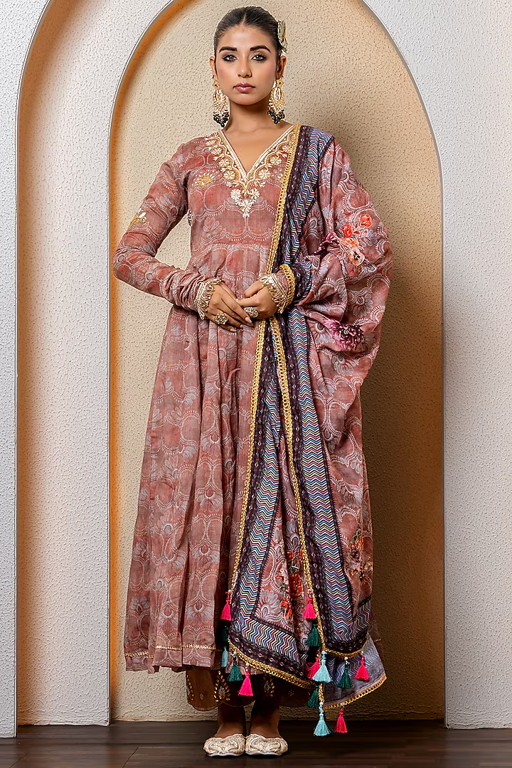 Featuring a pink anarkali in chanderi base with digital print and hand embroidery. It is paired with cotton pants and a multi-colored organza dupatta having lappa work.