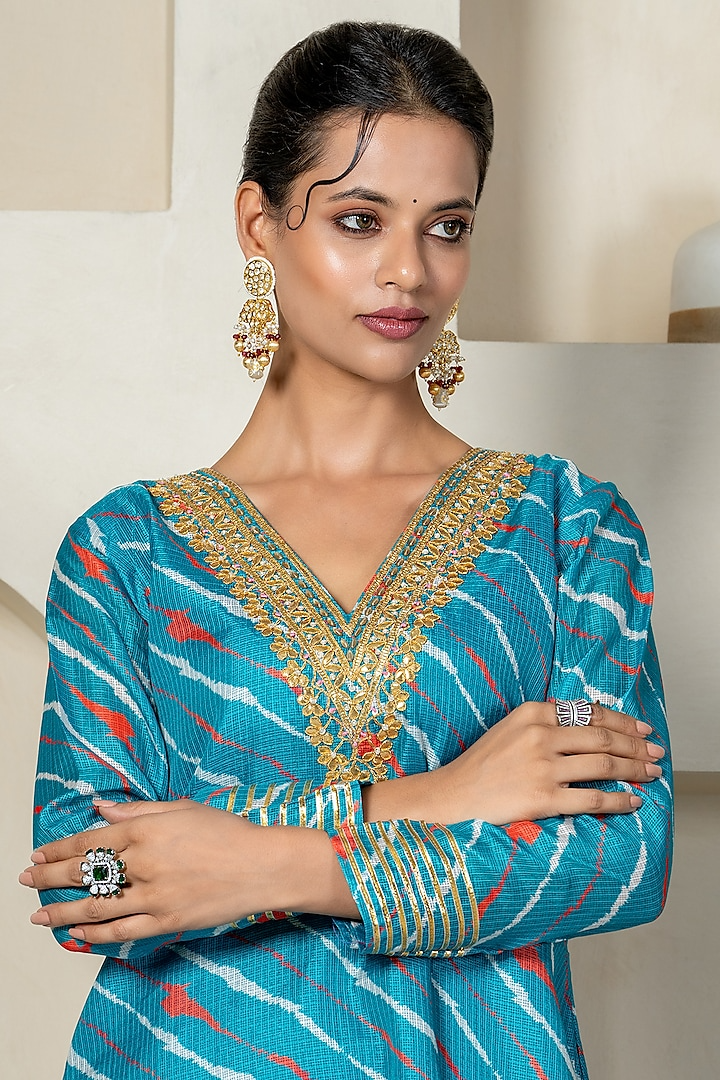 Teal Blue & Yellow Chanderi Floral Printed Anarkali Set