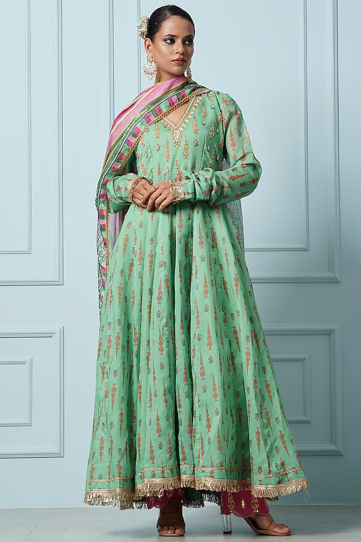 Pista Green Chanderi Floral Printed Anarkali Set