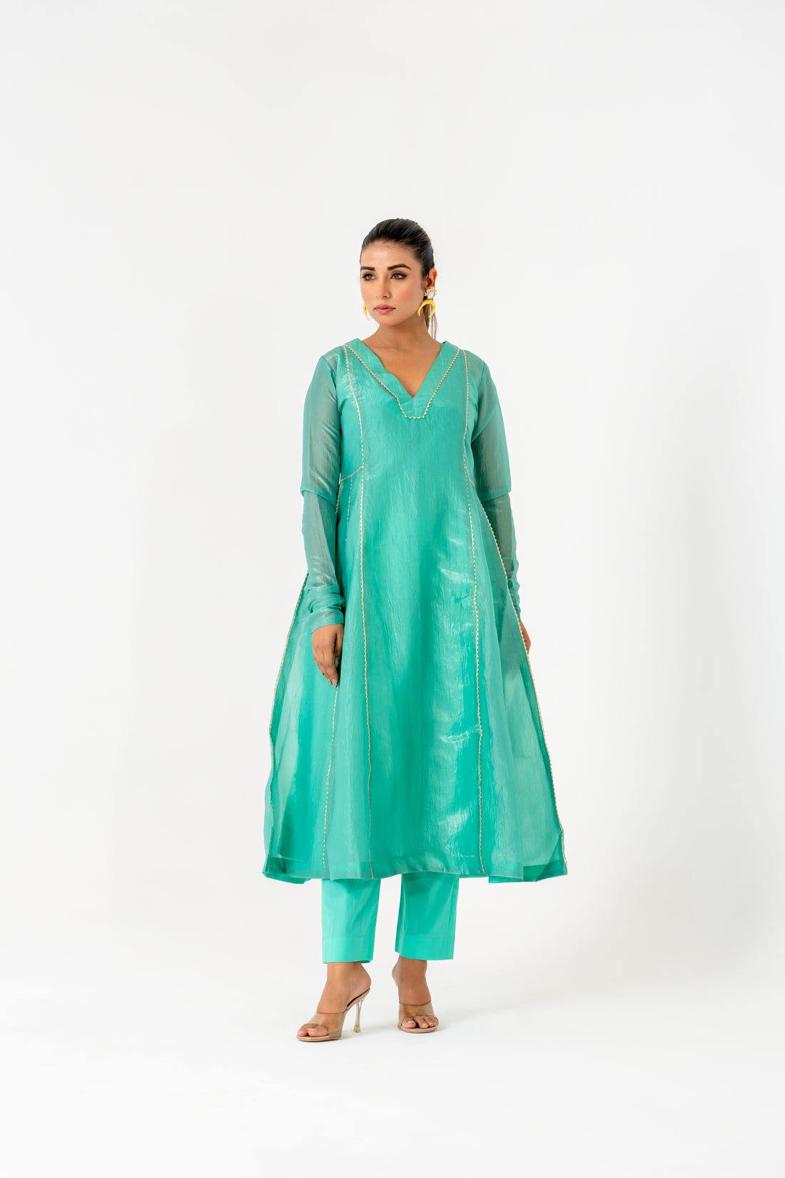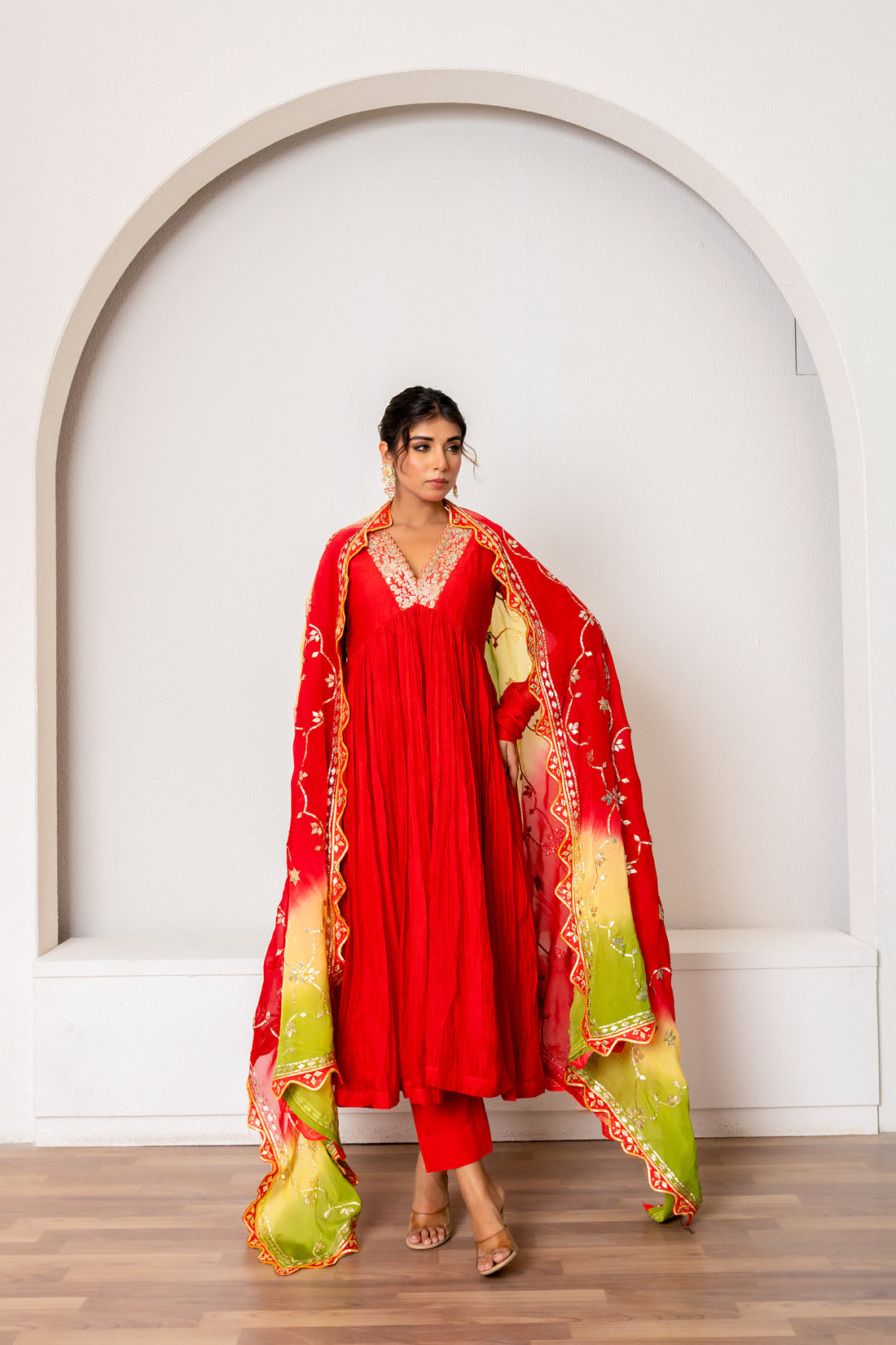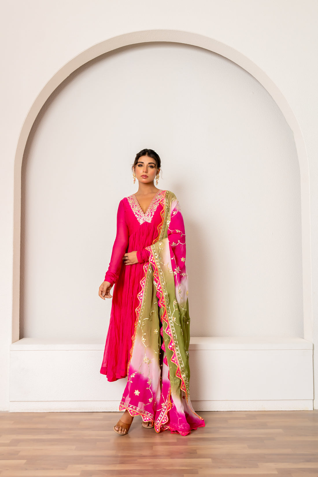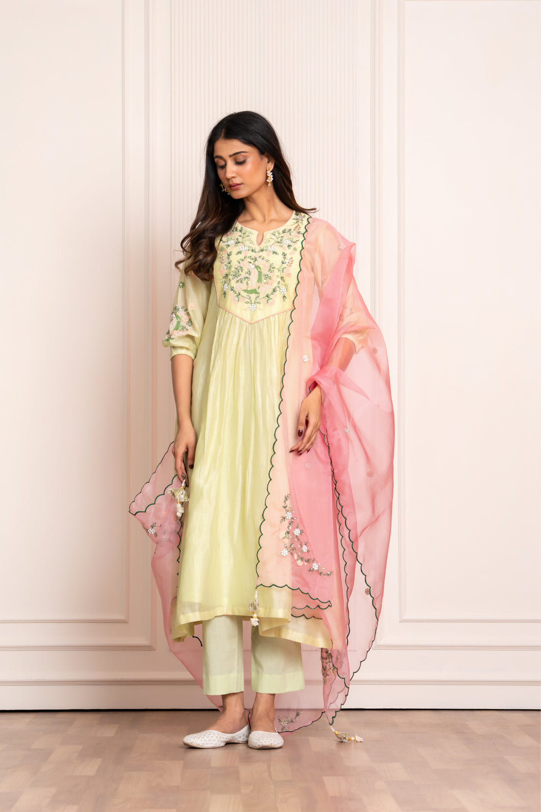 Neon Green Pure muslin handblock Printed Anarkali Set