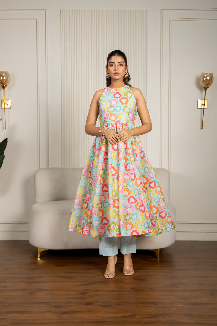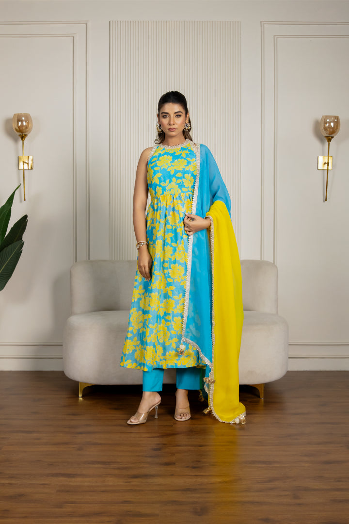 Teal Blue & Yellow Chanderi Floral Printed Anarkali Set