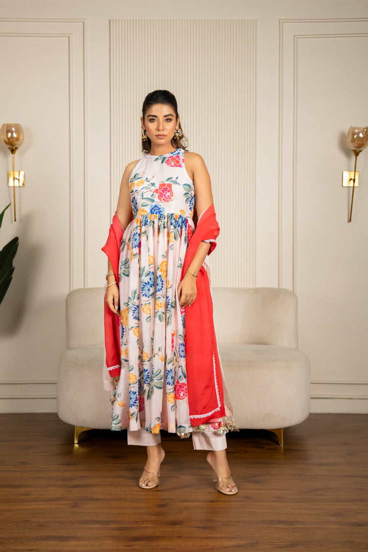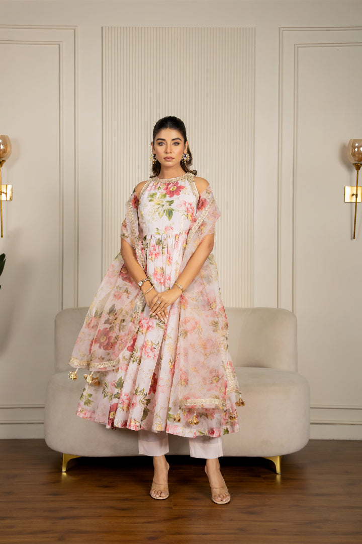 Multi-colored Chanderi Floral Printed Anarkali Set