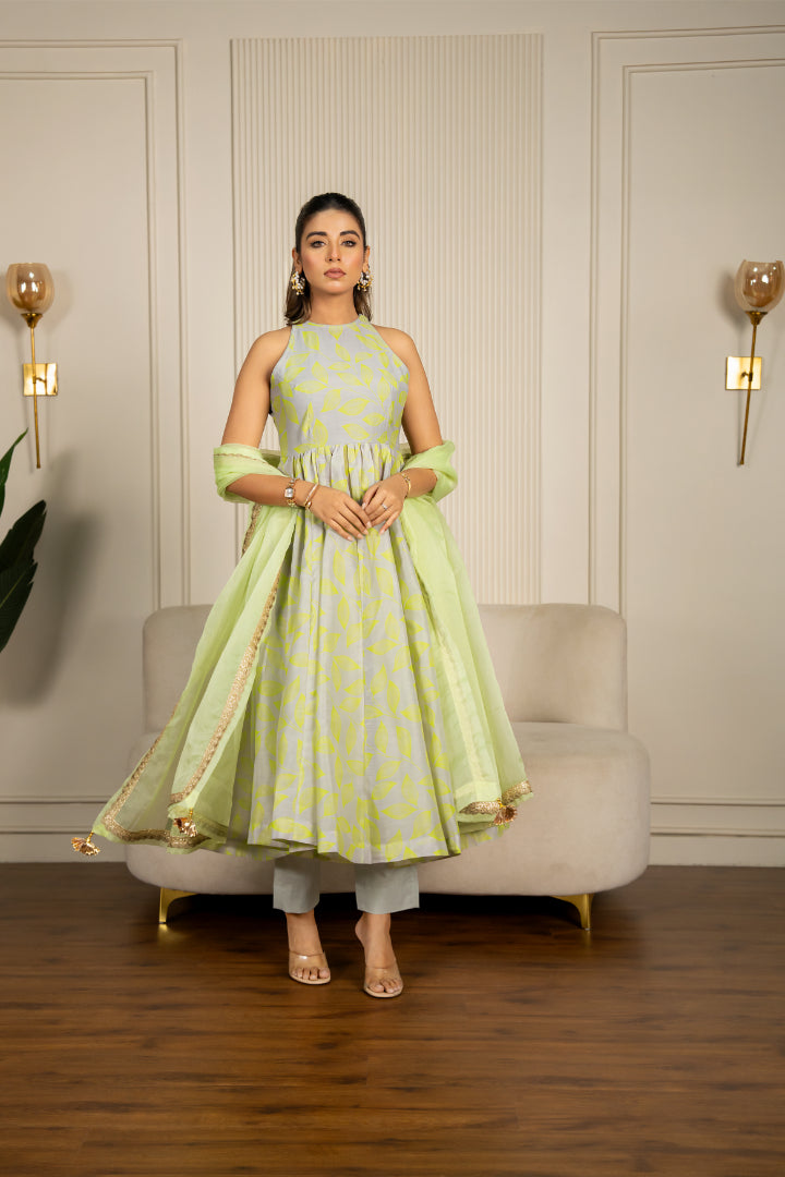 Neon Green & Grey Chanderi Floral Printed Anarkali Set - 2