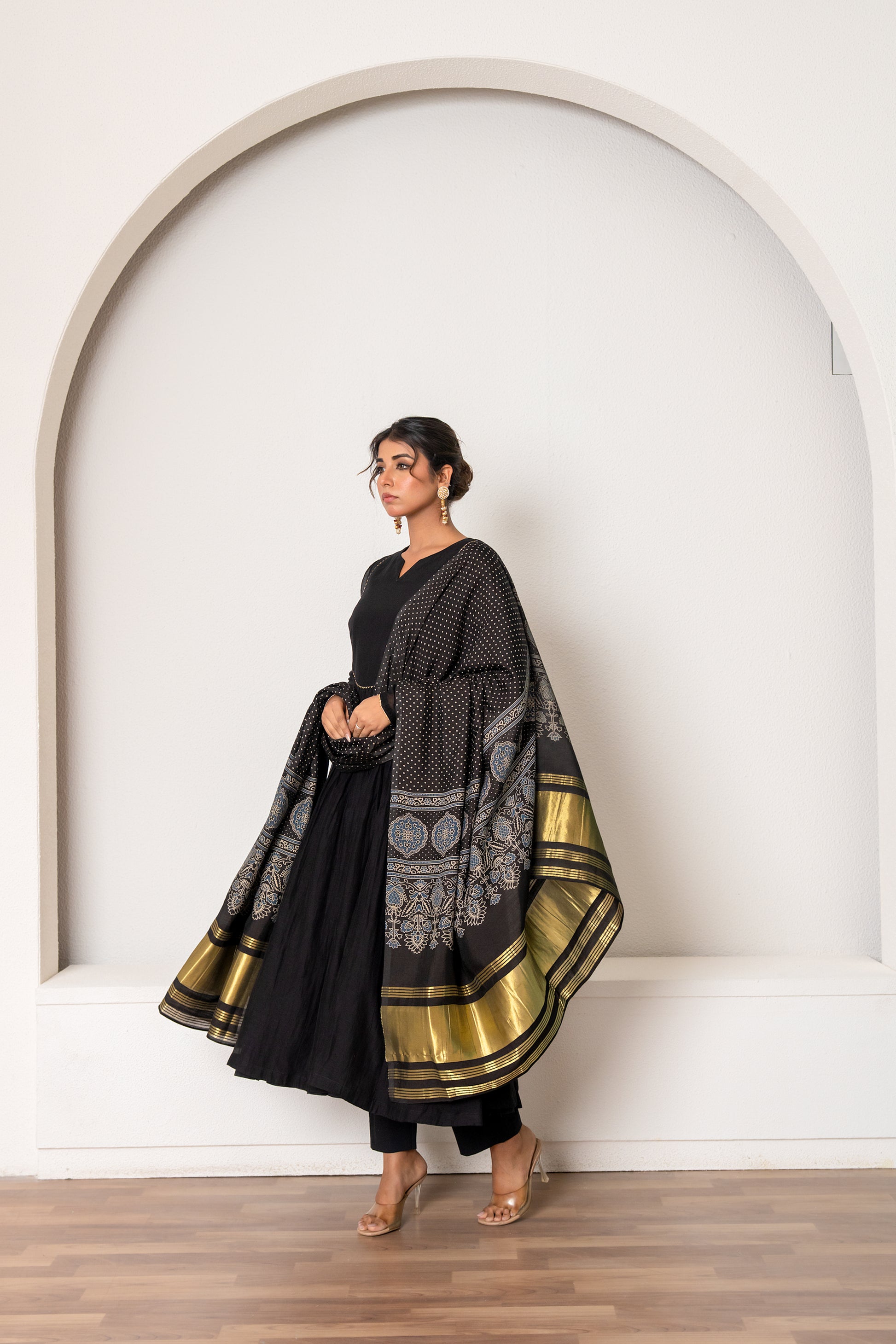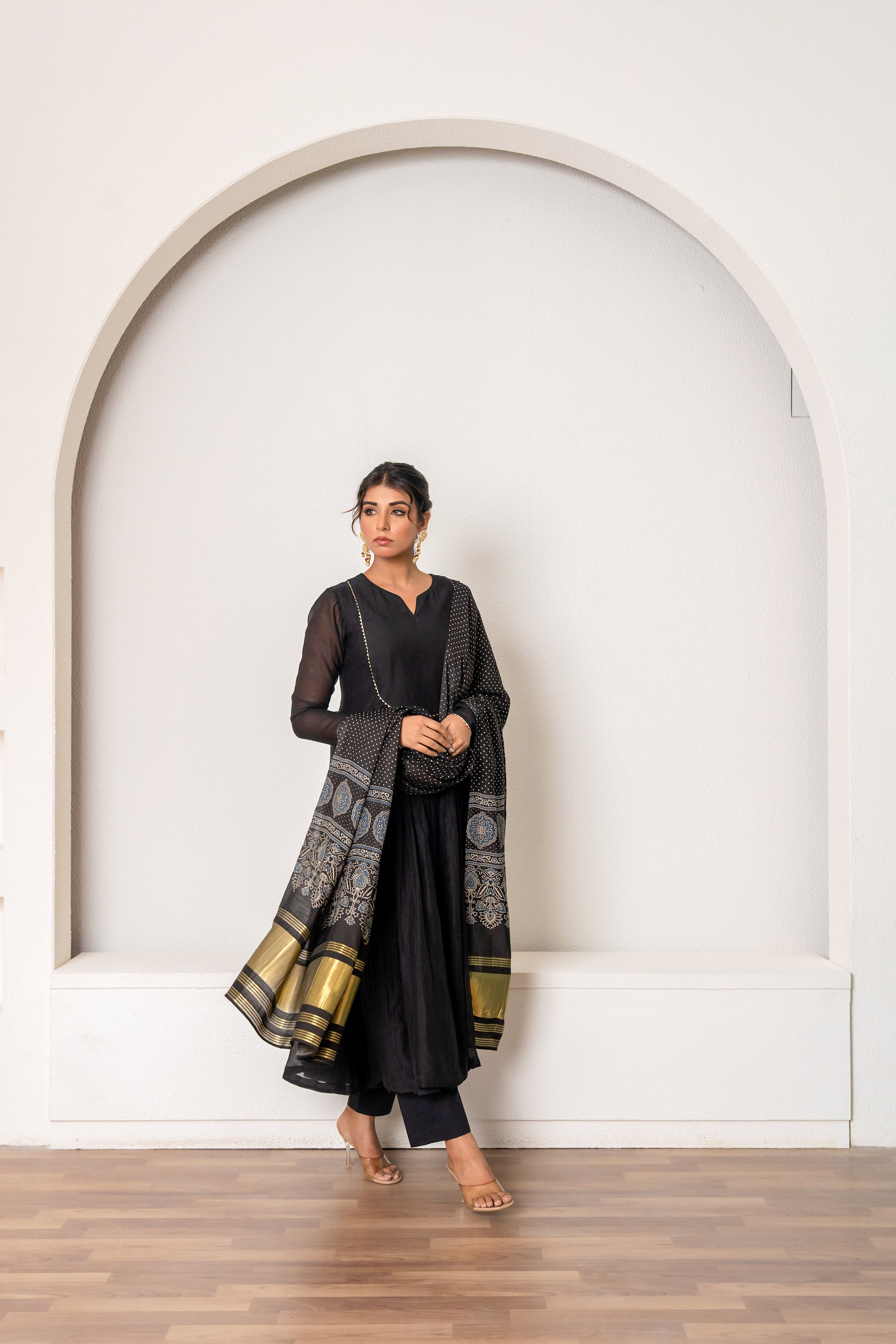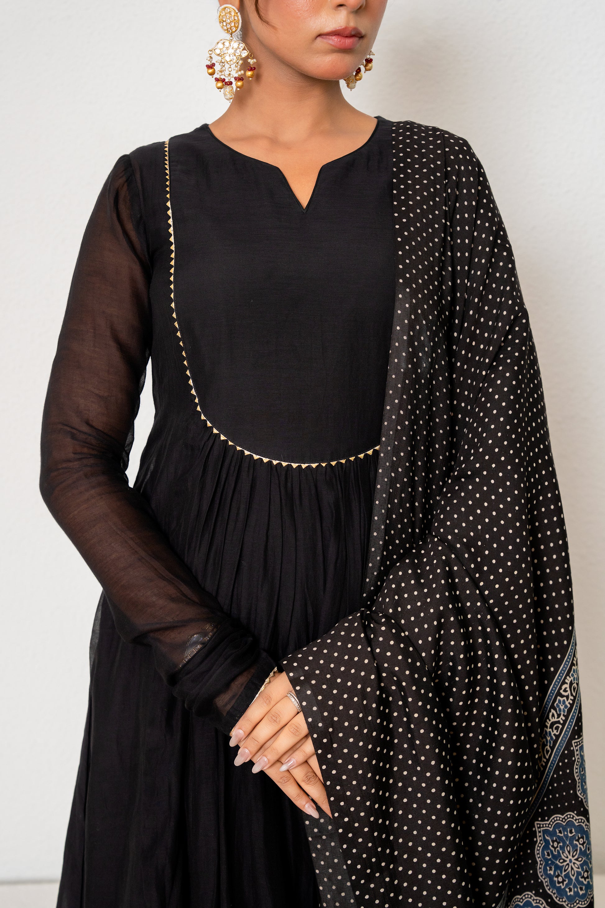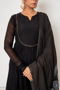 Featuring a black kurta in mul chanderi base with hand embroidered yoke on neckline. It is paired with organza dupatta. It comes with matching pants and an inner. Accentuate it with statement jewellery and heels for a festive occasion.