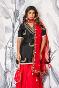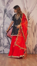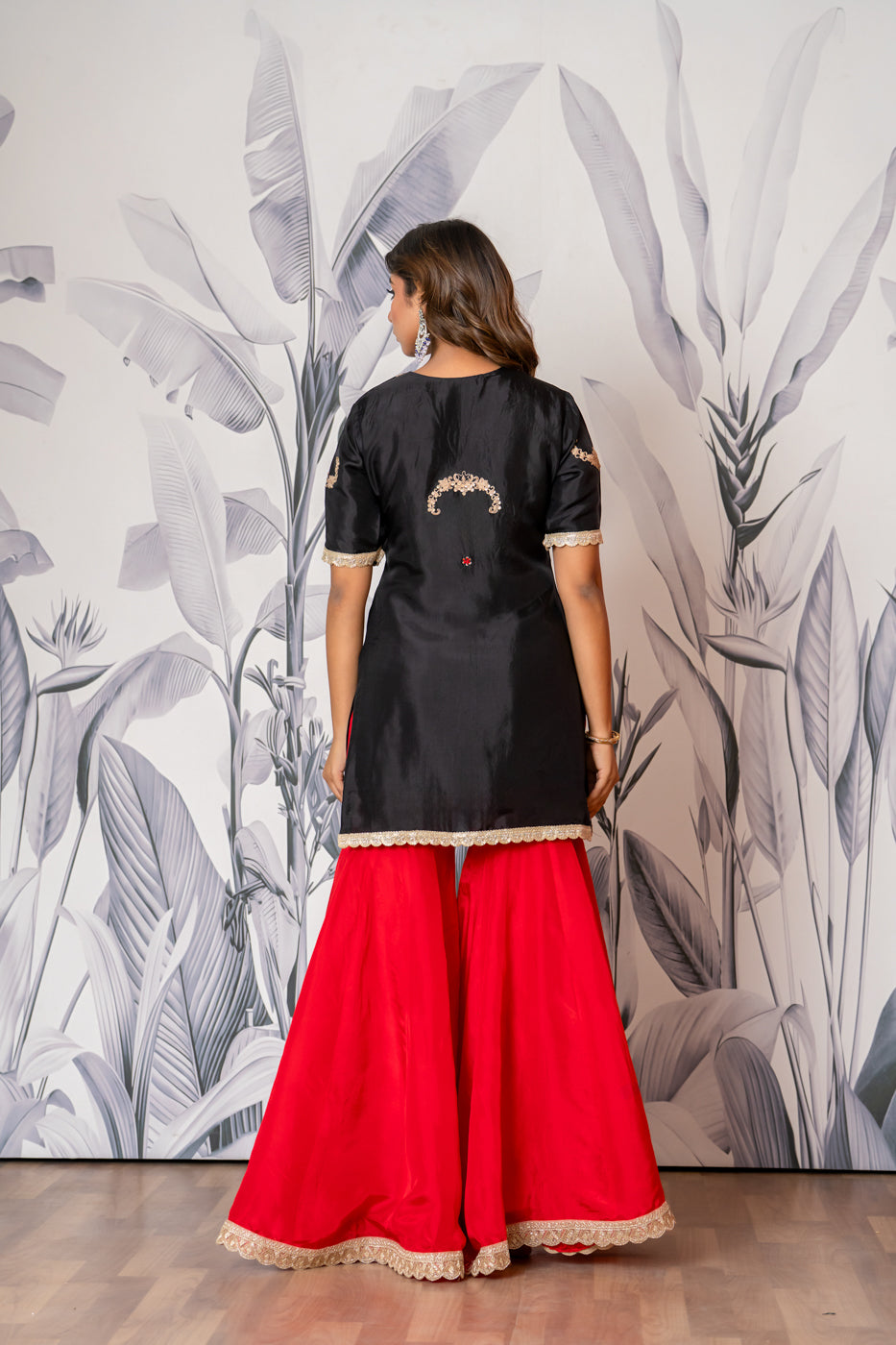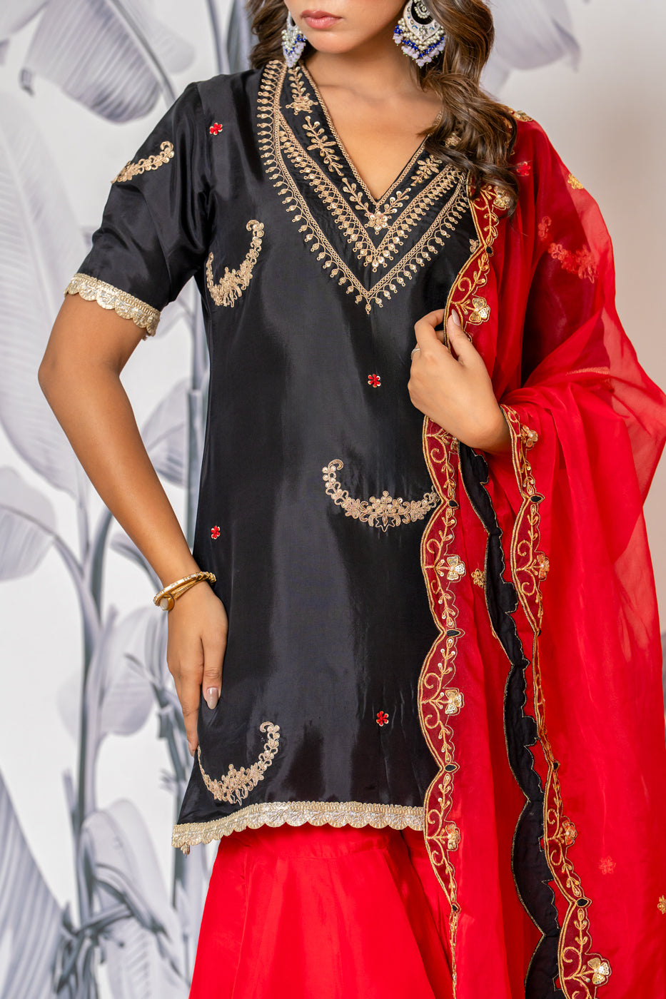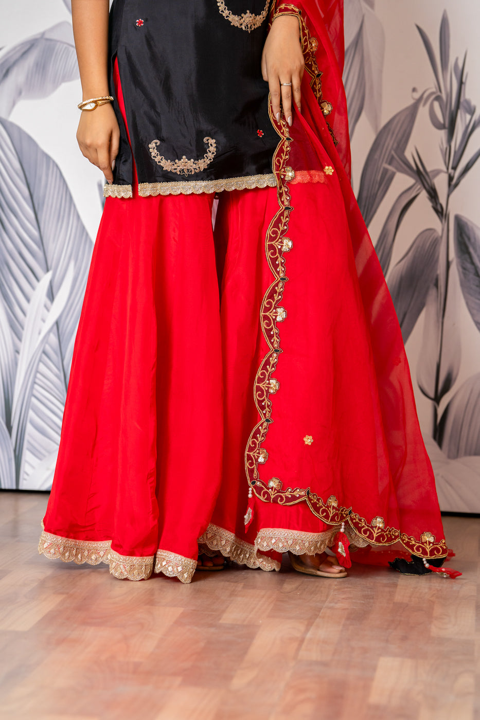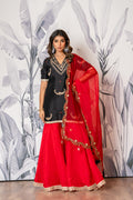 Black & Red Pure Spun Silk Marodi Embroidered Sharara Set