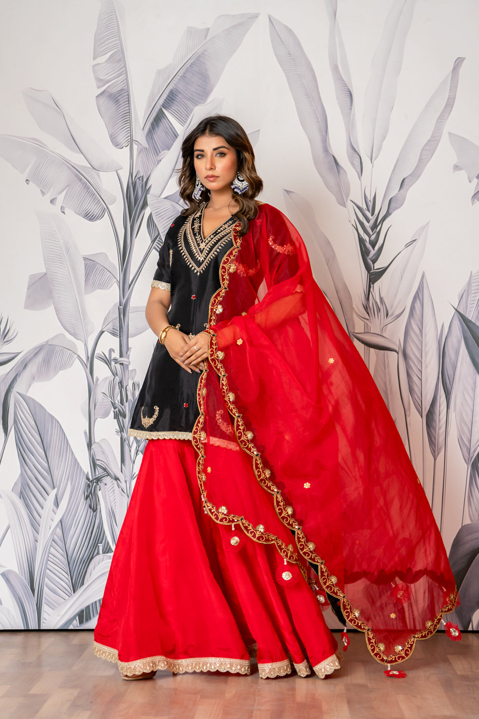 Featuring a black kurta in pure spun silk base with thread and marodi embroidery. It is paired with contrast red sharara pants and red organza embroidered dupatta. Style this designer sharara set with chandbali earrings and juttis for any festive occasion.