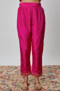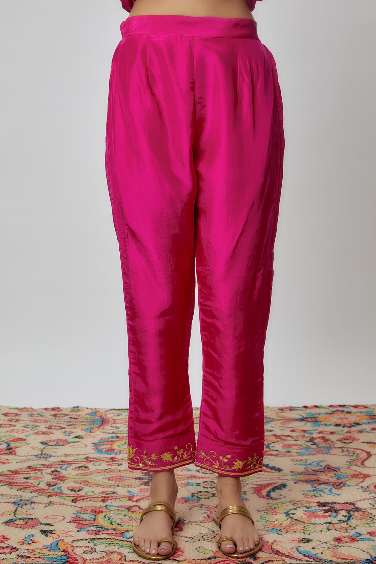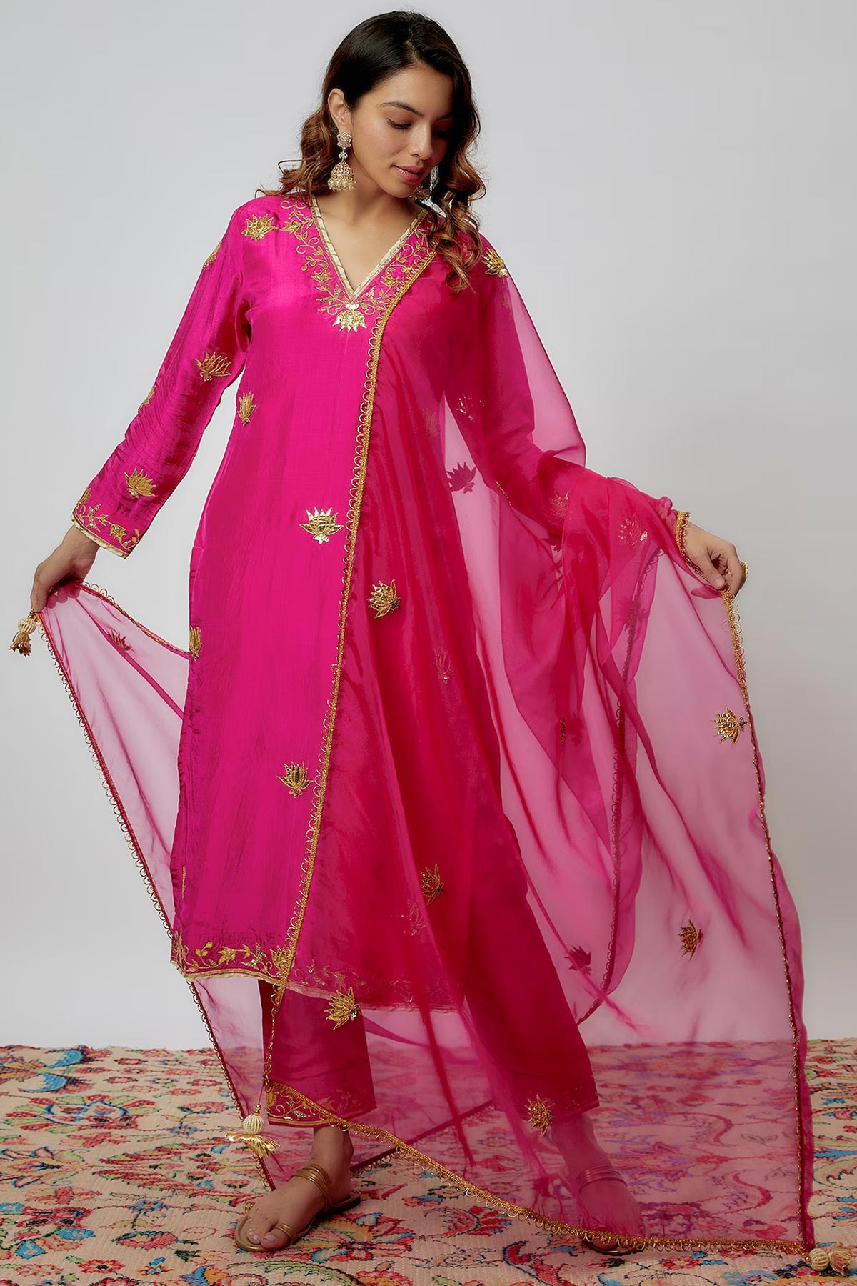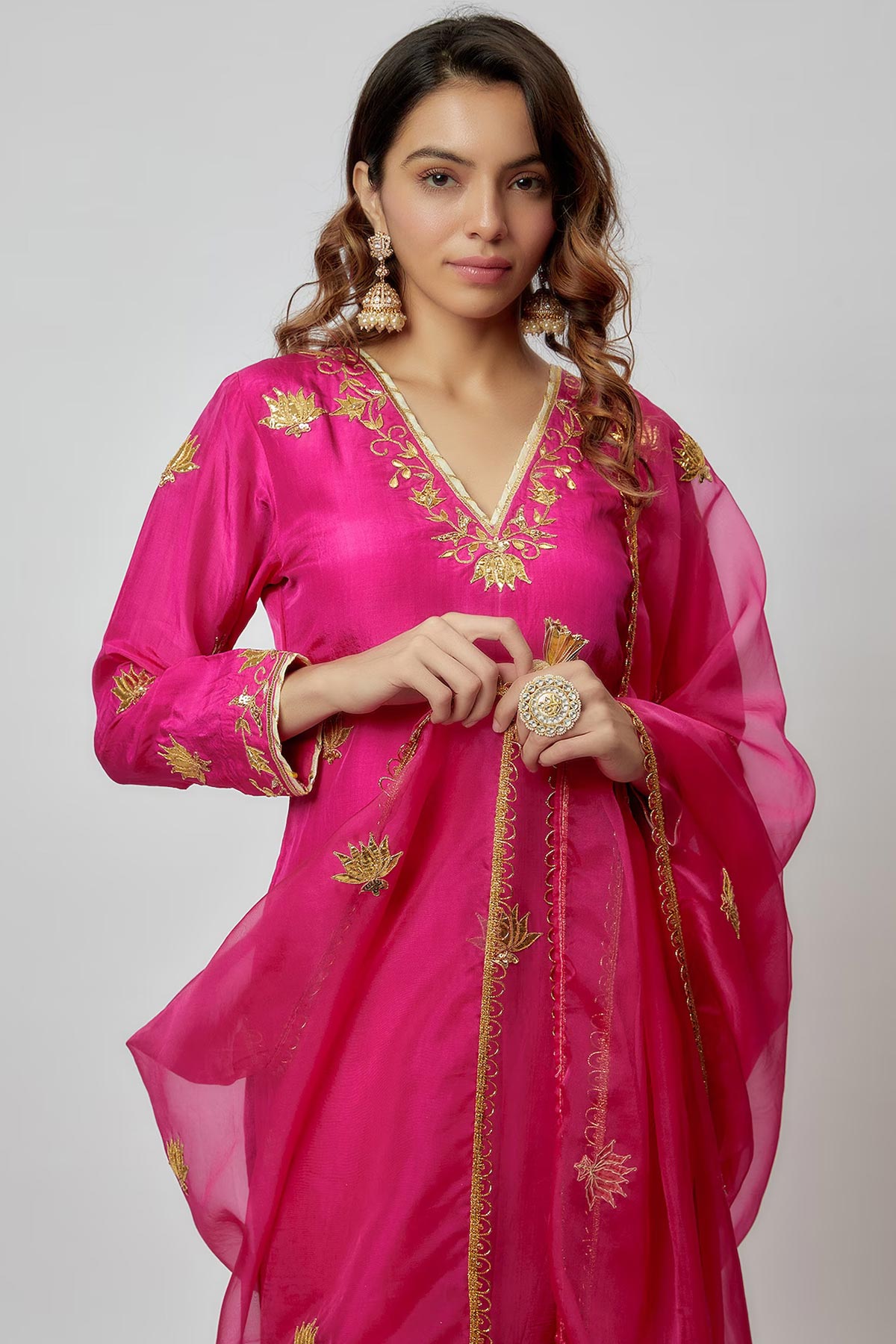 Featuring a hot pink kurta in pure spun silk base with hand embroidery. It is paired with matching pants and an organza dupatta with hand embroidered motives.