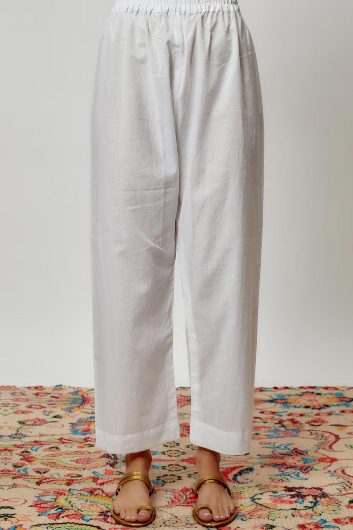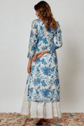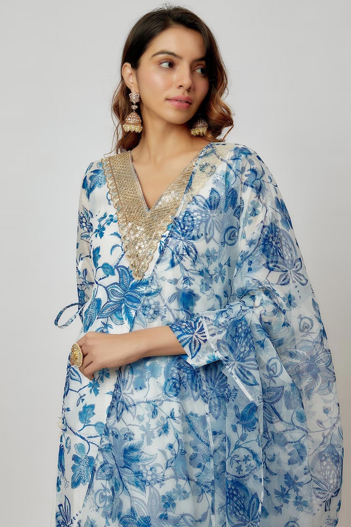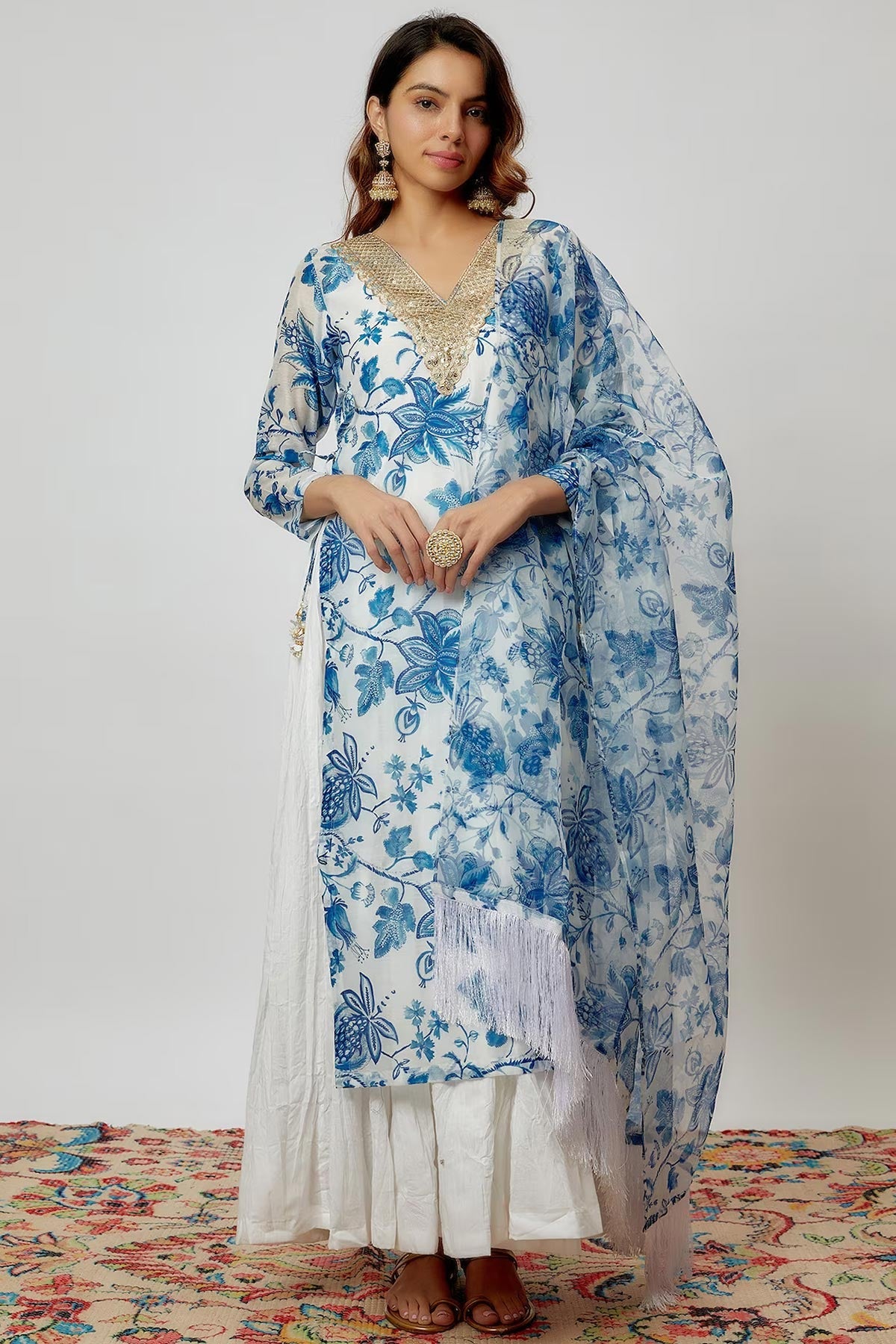 Featuring a white and blue kurta in chanderi base. It is paired with a white cotton crushed anarkali, pants, and an organza dupatta having fringes on the bottom.