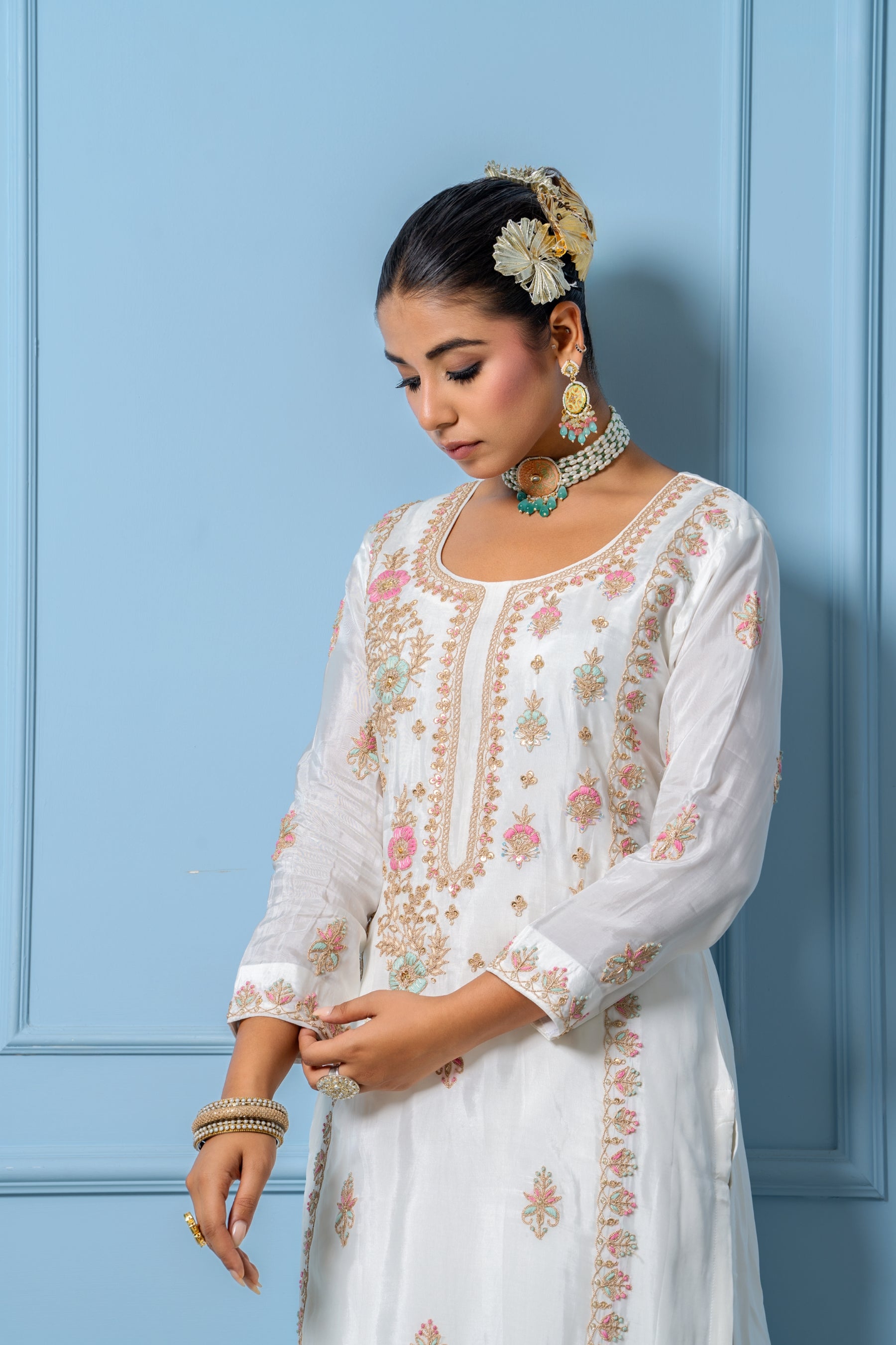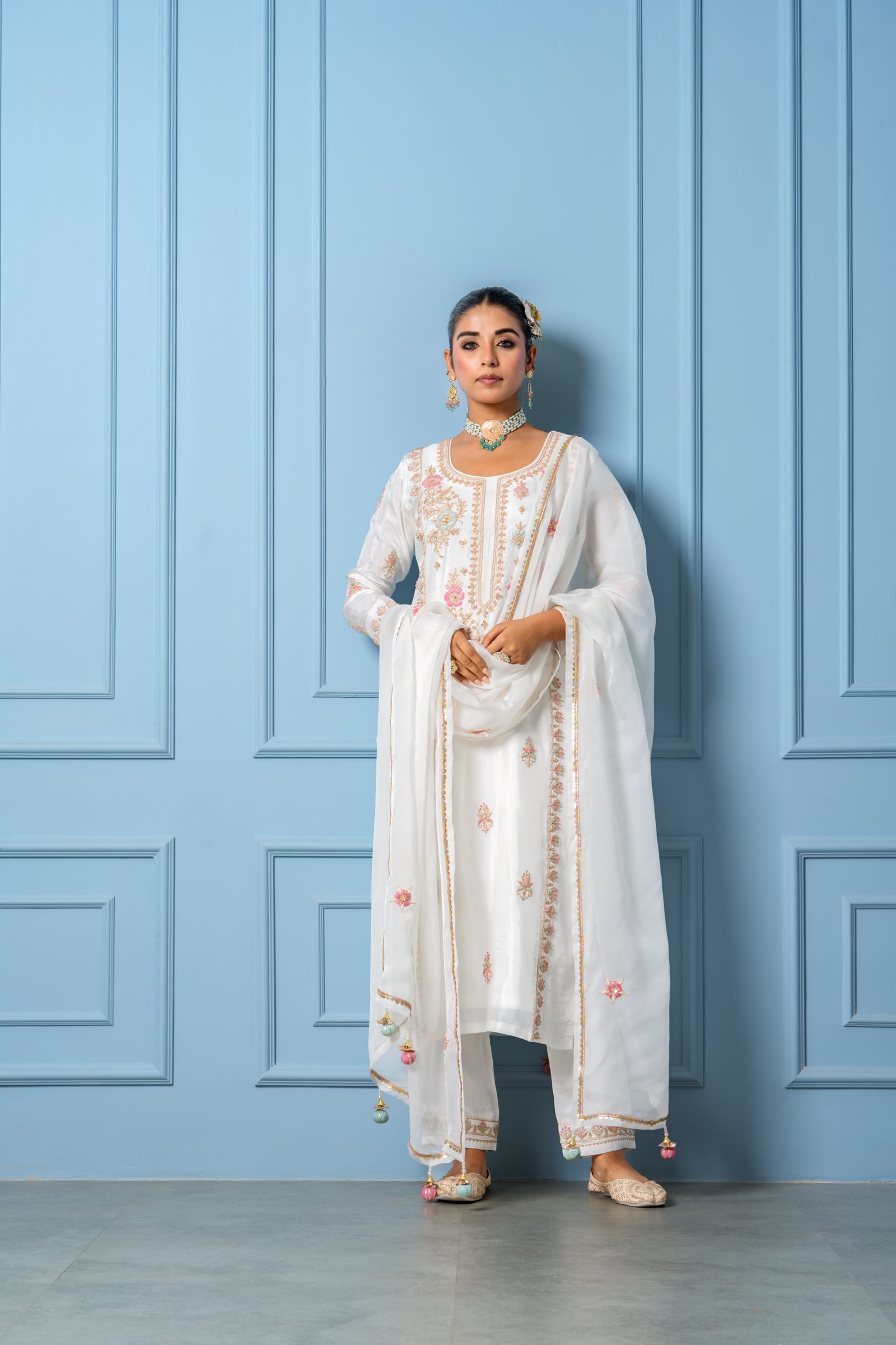 Featuring a ivory kurta in pure spun silk base with hand embroidery. It is paired with matching pants and pure organza dupatta. Accentuate it with chandbali earrings and juttis for any festive occasion or haldi ceremony.