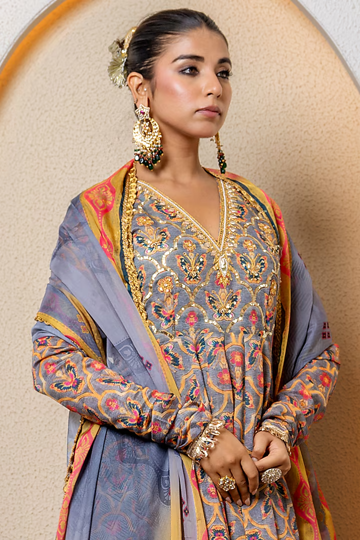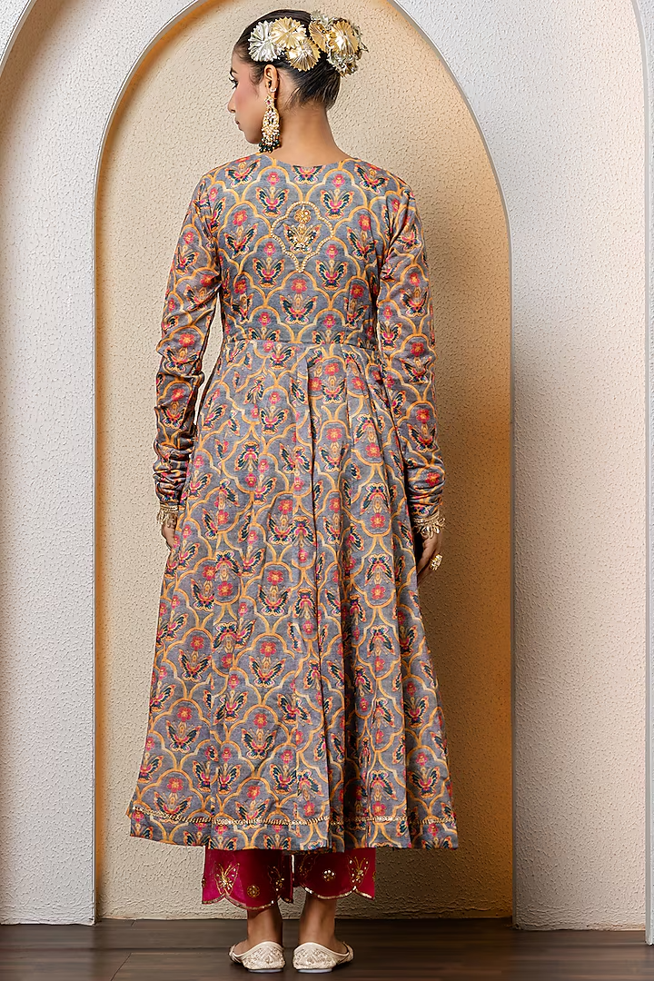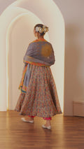 Featuring a multi-colored anarkali in chanderi base with digital print. It is paired with cotton pants and a muslin printed dupatta. Accentuate it with chandbali earrings and juttis for a festive ready-look.