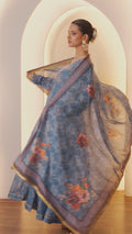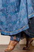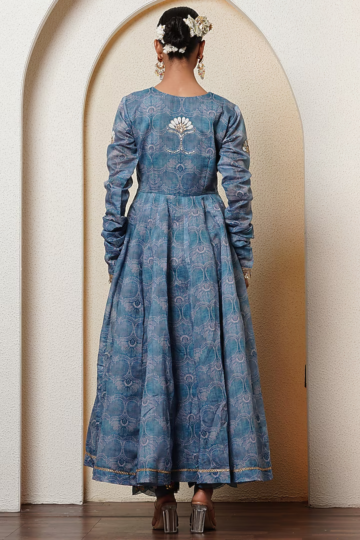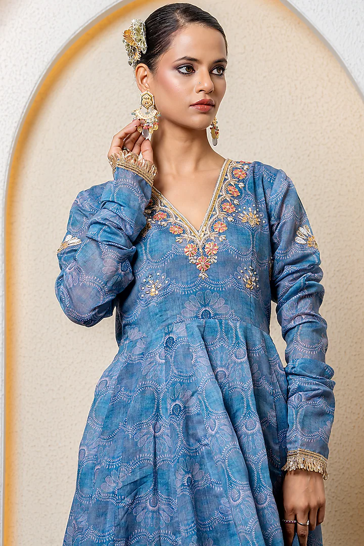 Featuring a navy blue anarkali in chanderi base with digital print and handcrafted neckline. It is paired with pants and a muslin printed dupatta. Accentuate it with chandbali earrings and juttis for a festive ready-look.