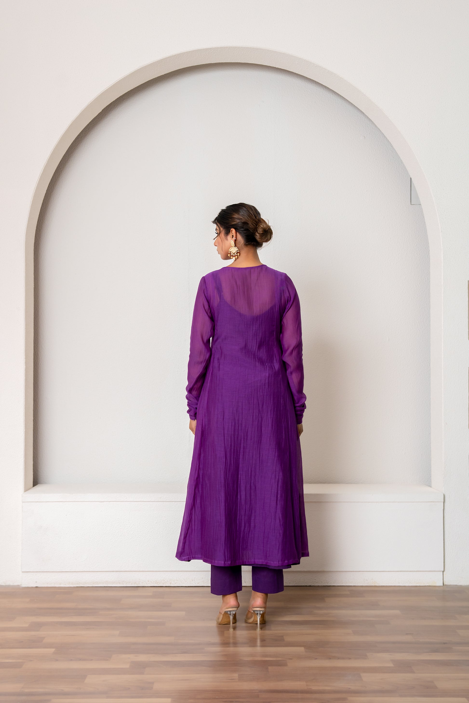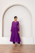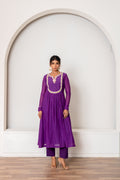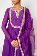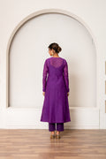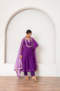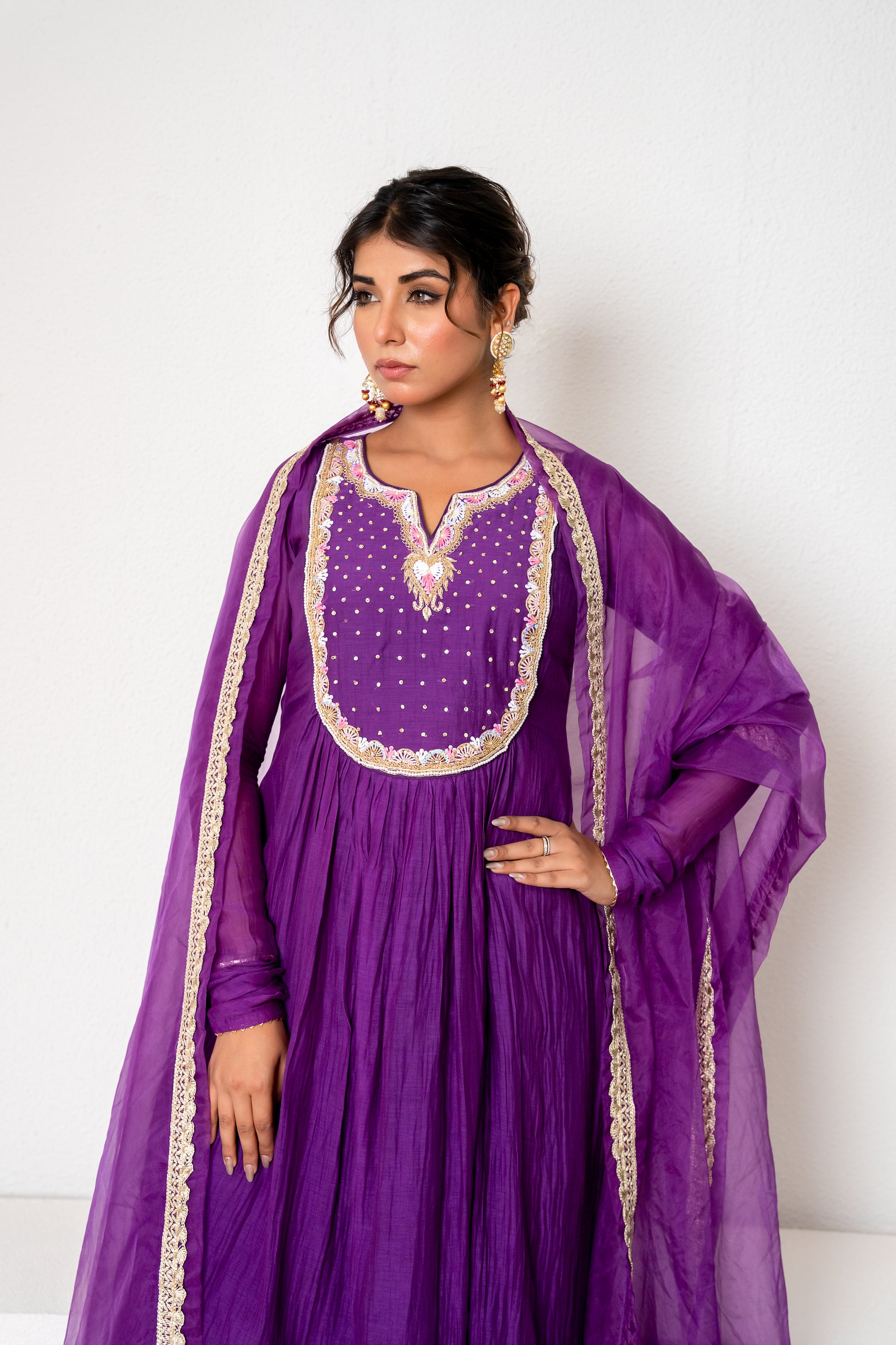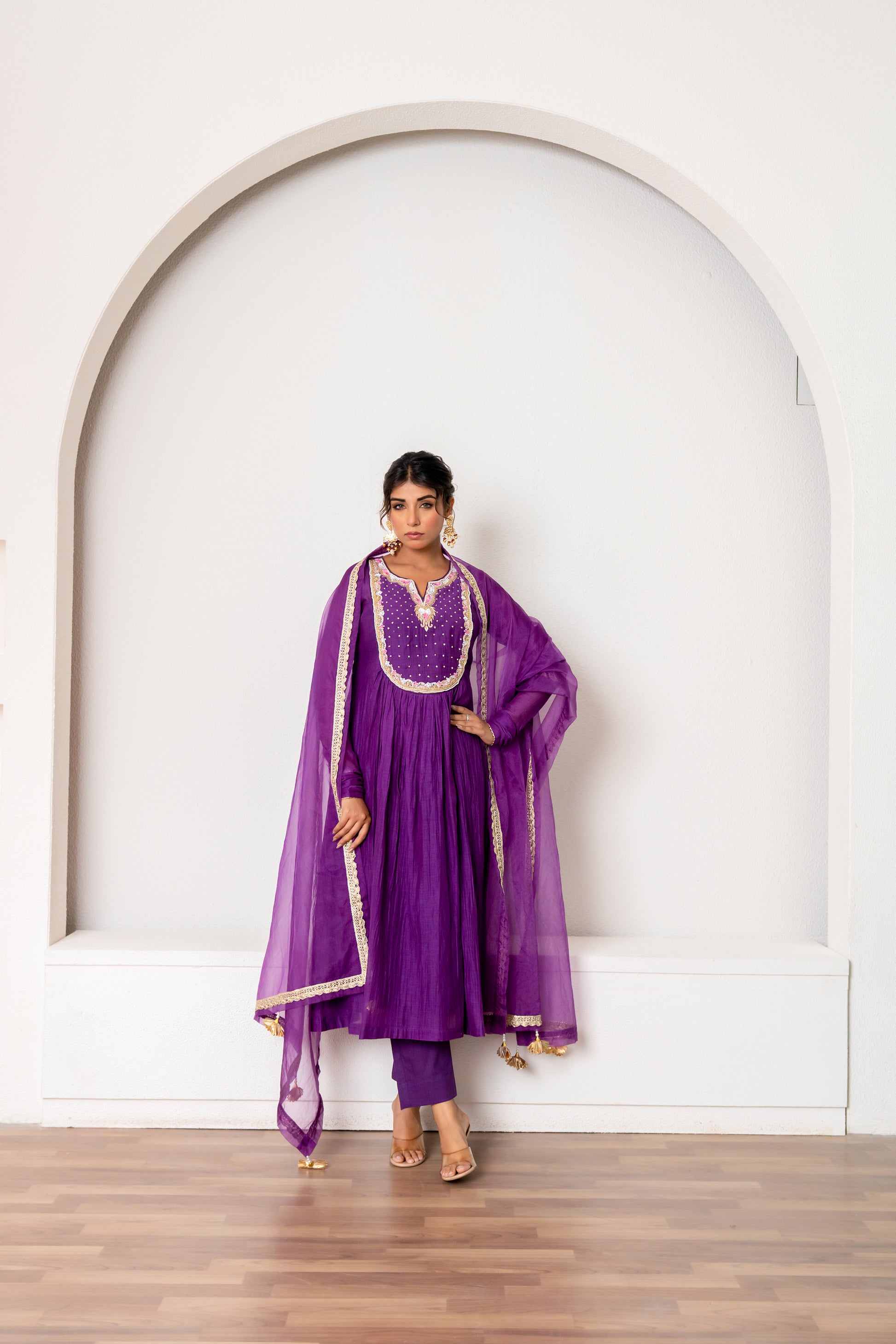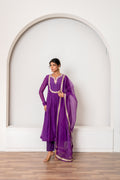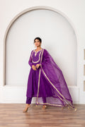 Featuring a purple kurta in mul chanderi base with hand embroidered yoke on neckline. It is paired with organza dupatta. It comes with matching pants and an inner. Accentuate it with statement jewellery and heels for a festive occasion.